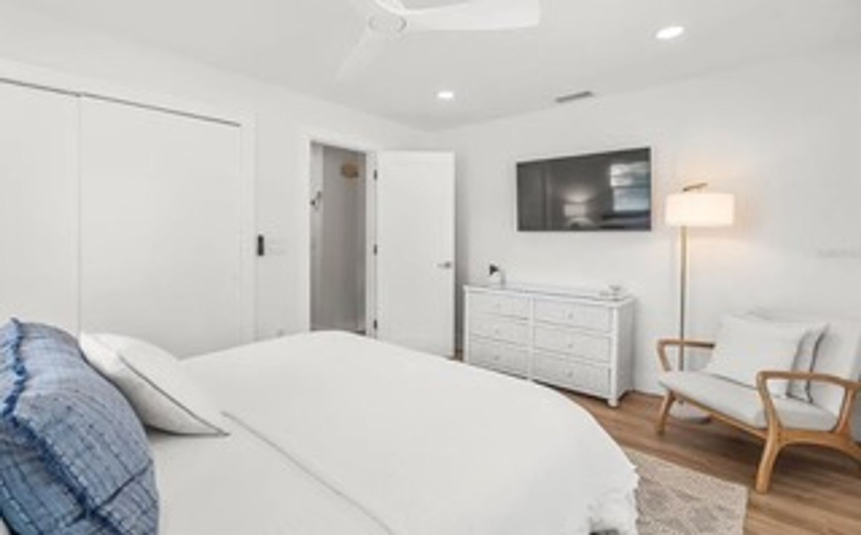 Seasonal or short term rental only Amazing beautifully renovated 3/2 home in a peaceful setting that is close to everything Sarasota has to offer. This home appears to be brand new construction of high end materials with stylish and comfortable furnishings in an open planned design. The property is flooded with natural light from new impact windows and doors. The flooring is all solid surface so NO CARPETING! The kitchen is spacious with solid wooden cabinetry, topped with slab quartz counters with breakfast bar, and complimented with stainless steel appliances. The main bedroom is roomy, sunny with multiple windows, and has a king sized bed, walk in closet, and ensuite bathroom with dual sinks walk in glassed in shower. There is a fenced in back yard with a patio set up for al fresco dining, and a very private outdoor shower. The owner keeps a car in the garage but there is enough space for an additional vehicle. As you step outside this home to look around you see trees and water across the street yet you are close to shopping, casual and fine dining, downtown Sarasota, the theater, opera, museums, and only 6 minutes to Siesta Key! This home can be rented seasonally (December thru April) at $4500/month + tax or off season (rest of the year) at $3250/month + tax. You deserve a break in paradise-call today!